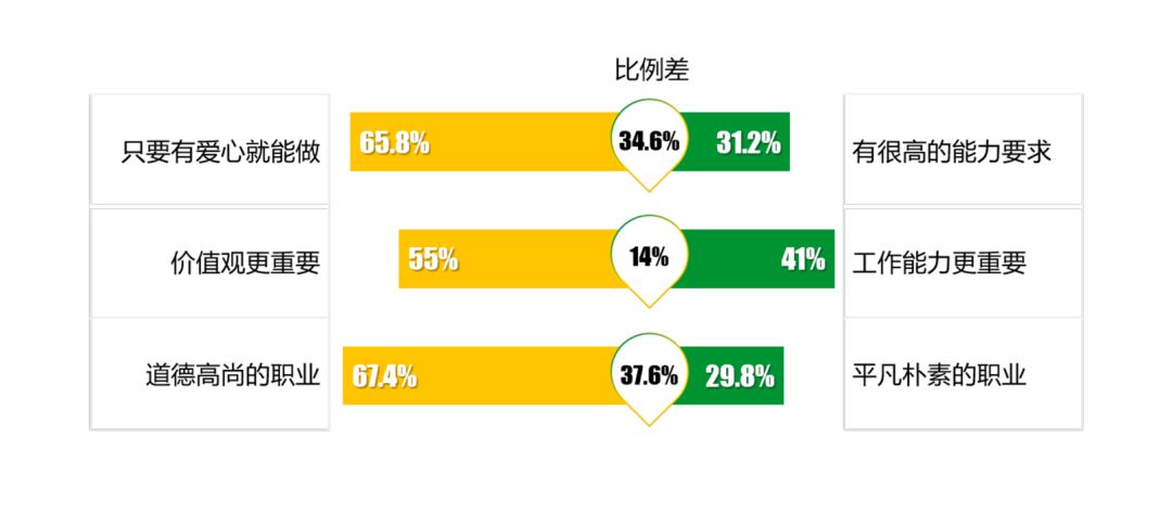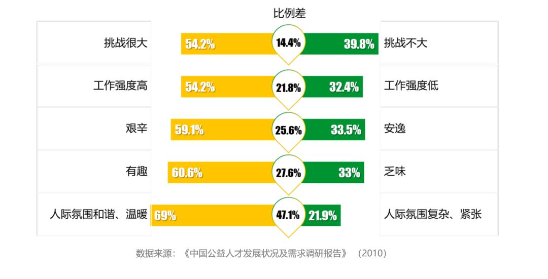 在2018年,墨德瑞特委托零点开展的公益职业社会认知调查中显示:多数公众认为公益职业是一份“挑战很大”(54.2%)、“工作强度高”(54.2%)、 “艰辛”(59.1%)的工作。这说明公众对公益事业开展的难度是有认知的,但同时认为公益职业“有趣”(60.6%)和人际氛围和谐&温暖(69.0%)的比例更高。
