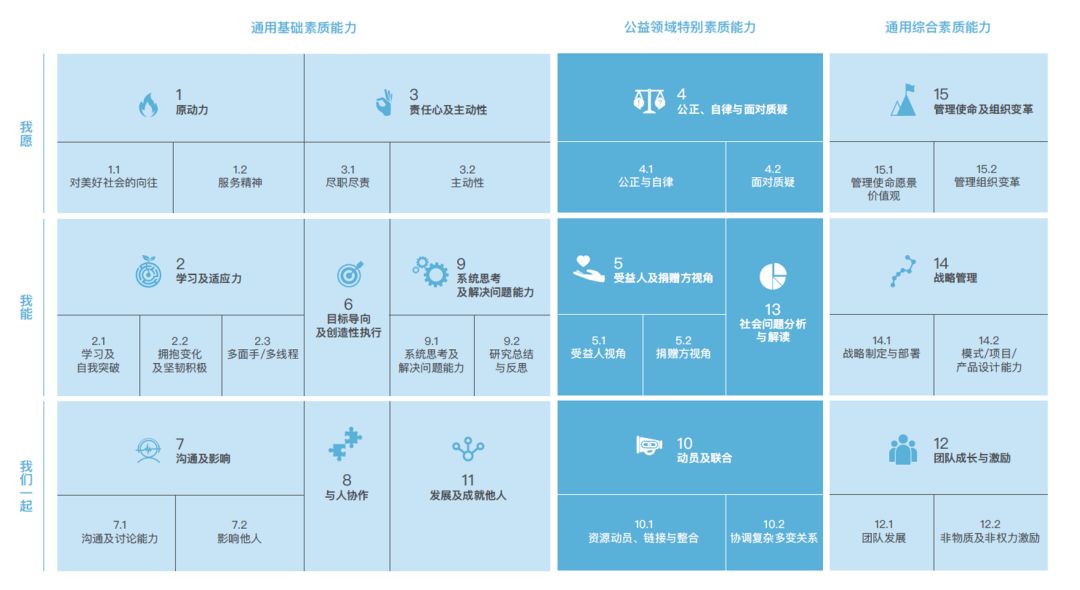 其中通用型能力是公益、商业、政府的人员建立人才“旋转门”的基础,只要具备若干通用能力就具备选择和从事公益职业的基础条件。而公益领域通用能力则是公益行业需要内生和建设的。
