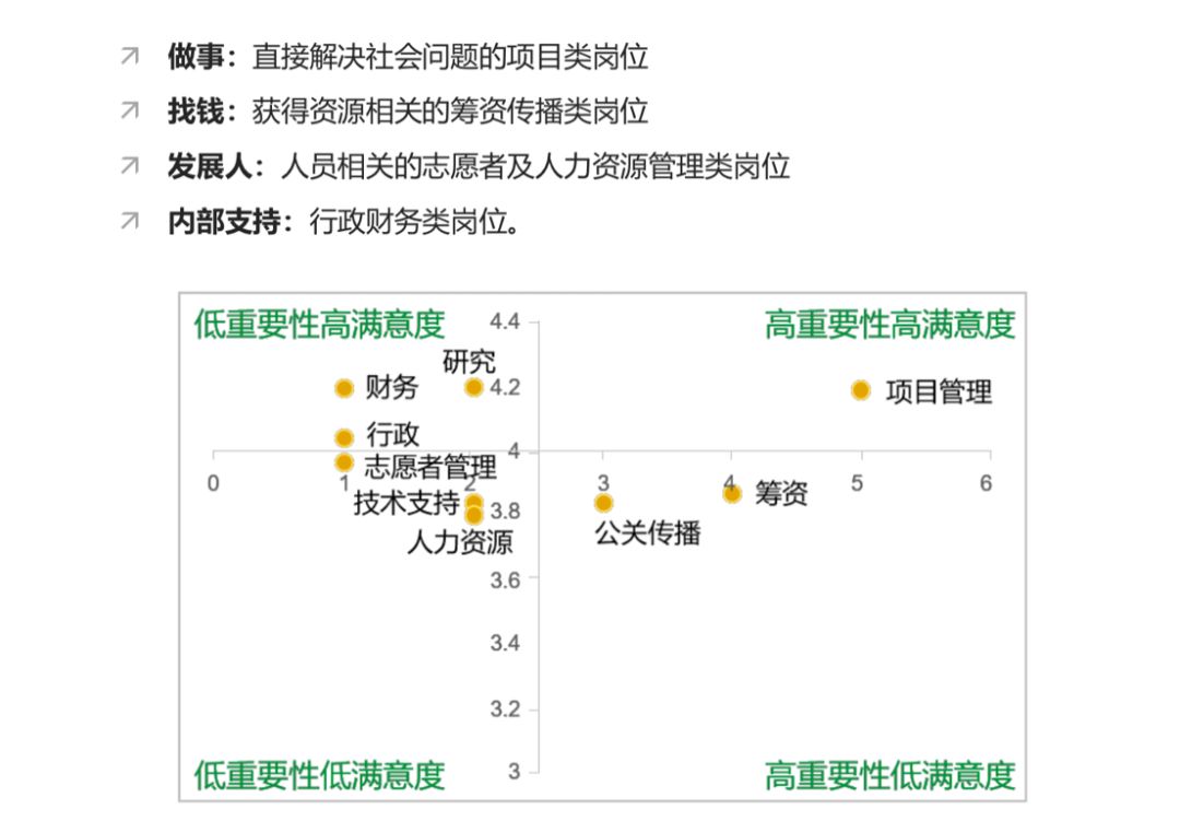 通过重要性和满意度两个指标的得分结合计算出职位改进的优先级。从职位的“满意度—重要性模型”的分布上看有非常有趣的发现:事、钱、人、内部支持非常分明的落在了不同的重要性-满意度象限中。