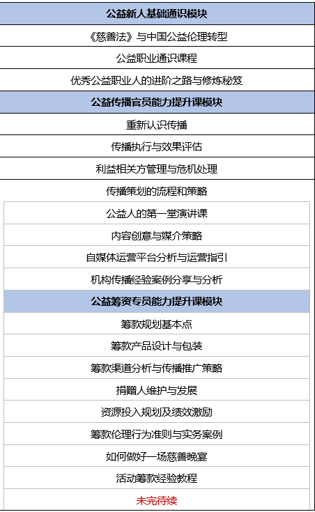课程包含三大模块,分别是公益新人基础通识课模块,公益筹资专员能力提升课程模块,公益传播官员能力提升课程模块。